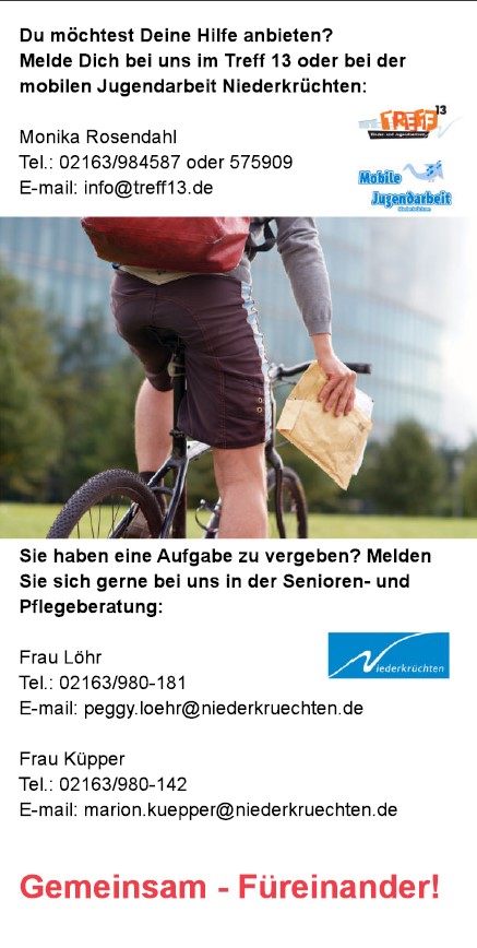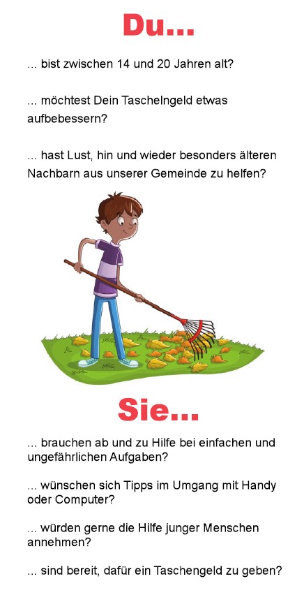 Die Taschengeldbörse bietet Jugendlichen ab 14 Jahren die Möglichkeit, sich zum Beispiel durch leichte Gartenarbeiten, ein Taschengeld hinzuzuverdienen. Oder Sie bringen Ihre Kompetenzen ein, indem Sie beim Umgang mit Handyproblemen helfen. Ältere Menschen, die diese Hilfe in Anspruch nehmen wollen, kontaktieren die Senioren- und Pflegeberatung der Gemeinde Niederkrüchten. Interessierte Jugendliche melden sich hierfür beim Treff13 in Elmpt oder bei der mobilen Jugendarbeit an.
