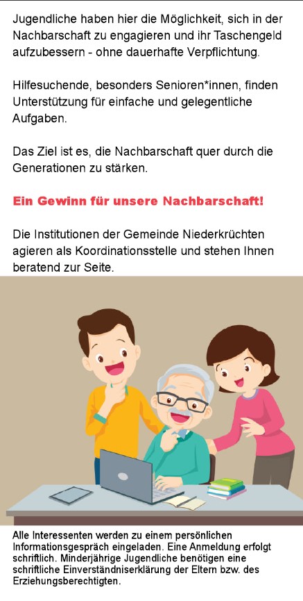 - Die Taschengeldbörse funktioniert als Kontakt- und Koordinierungsstelle für Jugendliche und Aufgabenanbieter. Zielgruppe sind Jugendliche zwischen 14 und 20 Jahren und Bürgerinnen und Bürger aus Niederkrüchten, die ab und zu mal Hilfe benötigen, insbesondere ältere Menschen.